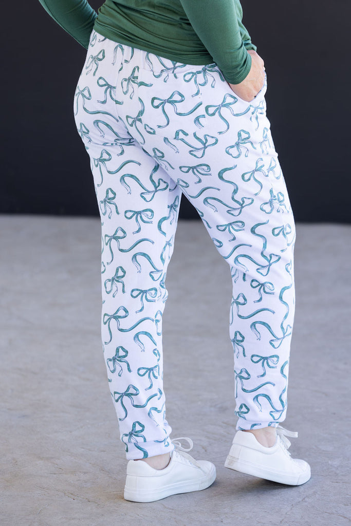 Bounce into comfort with our Classic Joggers in Green Ribbons! These playful pants feature cuffed bottoms, handy pockets (including a sneaky back pocket), and a stretchy waistband with a thick drawstring to keep everything in place. Our triple stretch fabric moves with you, whether you're lounging or lunging. Who said comfort can't look cool?