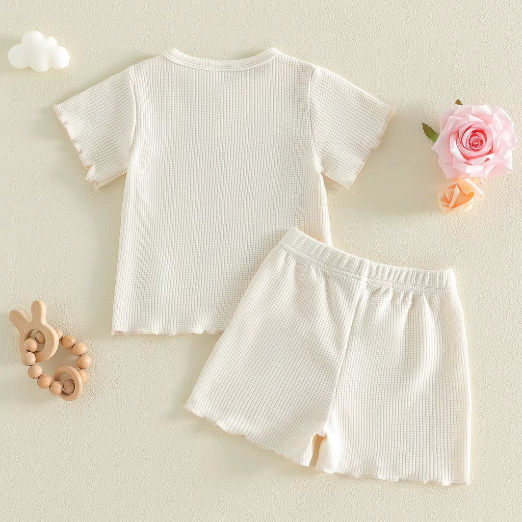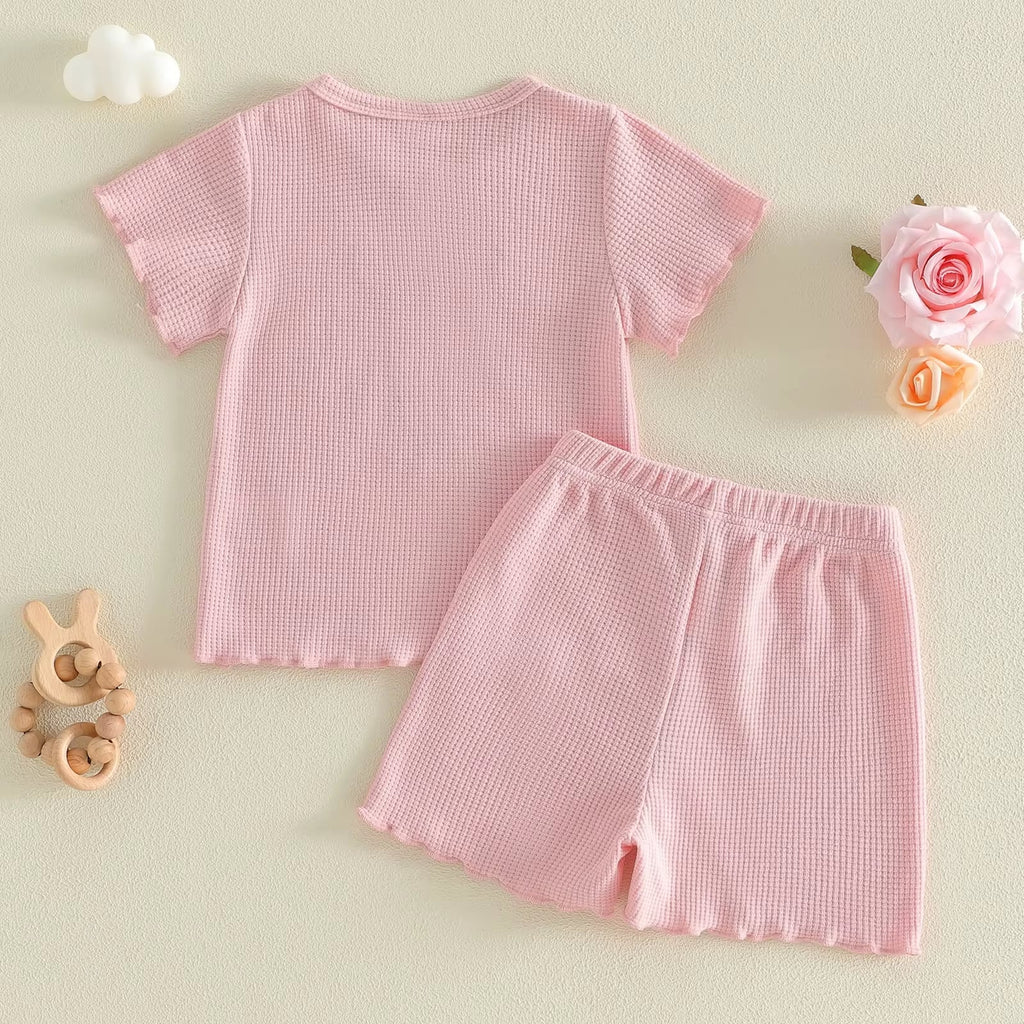 Adorable two-piece set featuring "Mama's Girl" and "Daddy's Girl" designs with cute bows on the front. Each set includes a short-sleeve shirt and matching shorts, perfect for little ones who love showing off their family pride. Made from a comfortable cotton-polyester blend (52% cotton, 48% polyester). Available in sizes 3/6M through 2-3T.
