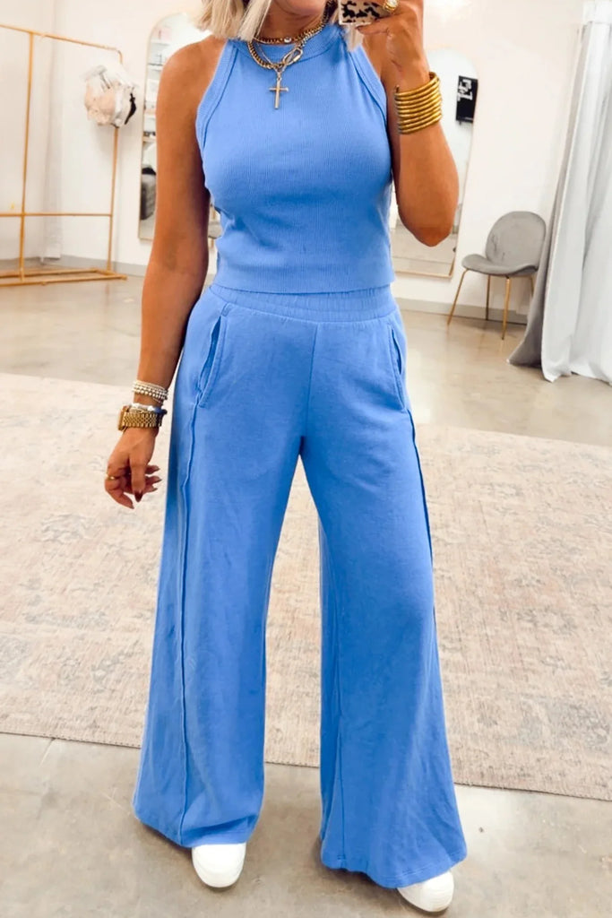 Here's your go-to combo that's equal parts comfy and chic. This two-piece pairs a sleeveless top with matching pants in a premium fabric blend. It moves with you all day long. Choose from three gorgeous colors and find your perfect fit across four sizes. Whether you're lounging, running errands, or stepping out, this set delivers effortless style without compromising on comfort. Elevate your wardrobe with this High quality set.