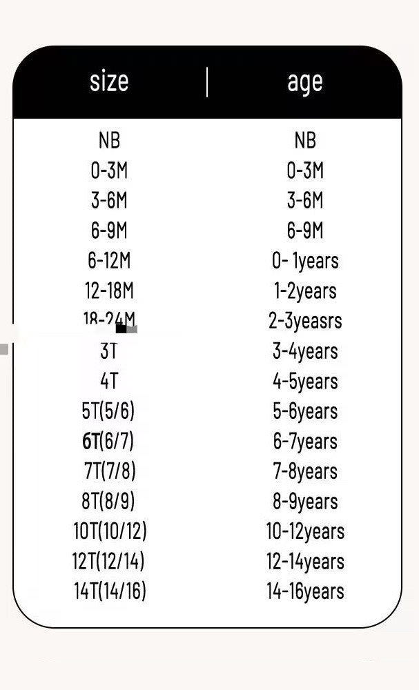 Sizes: NB, 0-3M, 3-6M, 6-9M, 6-12M, 12-18M, 18-24M, 3T, 4T, 5T, 6T, 7T, 8T, 10T, 12T, 14T