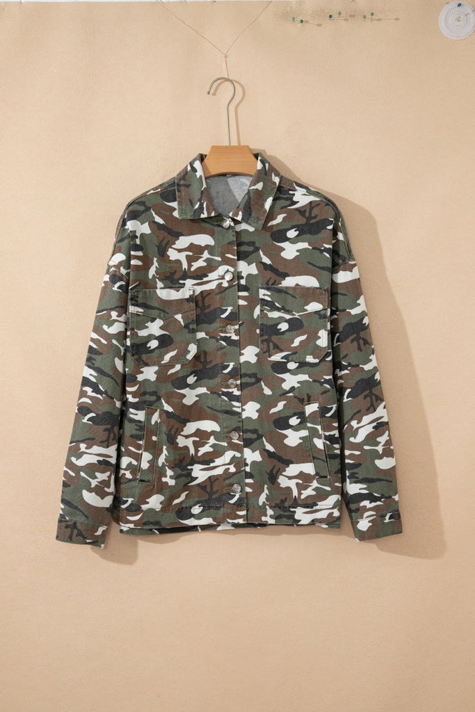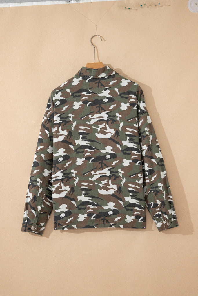 Layer up in style with our Camo Shacket—the perfect blend of edgy and effortless. Crafted from premium materials, this versatile piece features a classic collar, long sleeves, and functional side pockets to keep your essentials close. Whether you're throwing it over a tee or pairing it with a dress, this camo essential works overtime in your wardrobe. Get ready to make a statement.