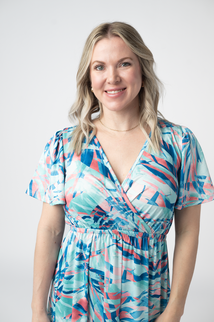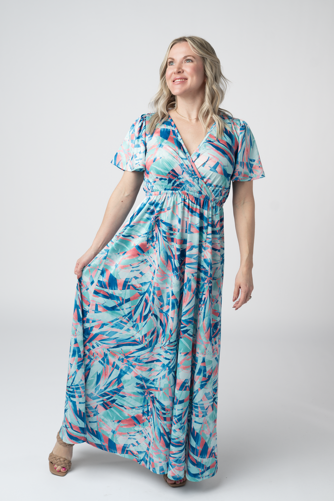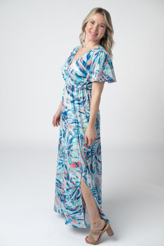 Dive into effortless summer style with the Millie Maxi Dress, featuring a stunning abstract print in aqua, pink, and dark blue. The flattering crossover neckline creates a chic silhouette, while the side slit adds just the right amount of movement and flair. Perfect for beach days, garden parties, or sunset strolls—this dress transitions seamlessly from day to night. Lightweight and breezy, it's your new go-to for warm-weather adventures.